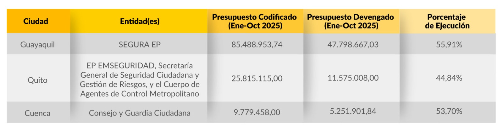 La información proviene de los informes de ejecución presupuestaria de las instituciones responsables de la seguridad ciudadana. En Quito, corresponden a la Empresa Pública Metropolitana de Logística para la Seguridad (EP EMSEGURIDAD), la Secretaría General de Seguridad Ciudadana y Gestión de Riesgos, y el Cuerpo de Agentes de Control Metropolitano. En Guayaquil, a la Empresa Pública Municipal SEGURA EP, y en Cuenca, al Consejo de Seguridad Ciudadana y a la Guardia Ciudadana.